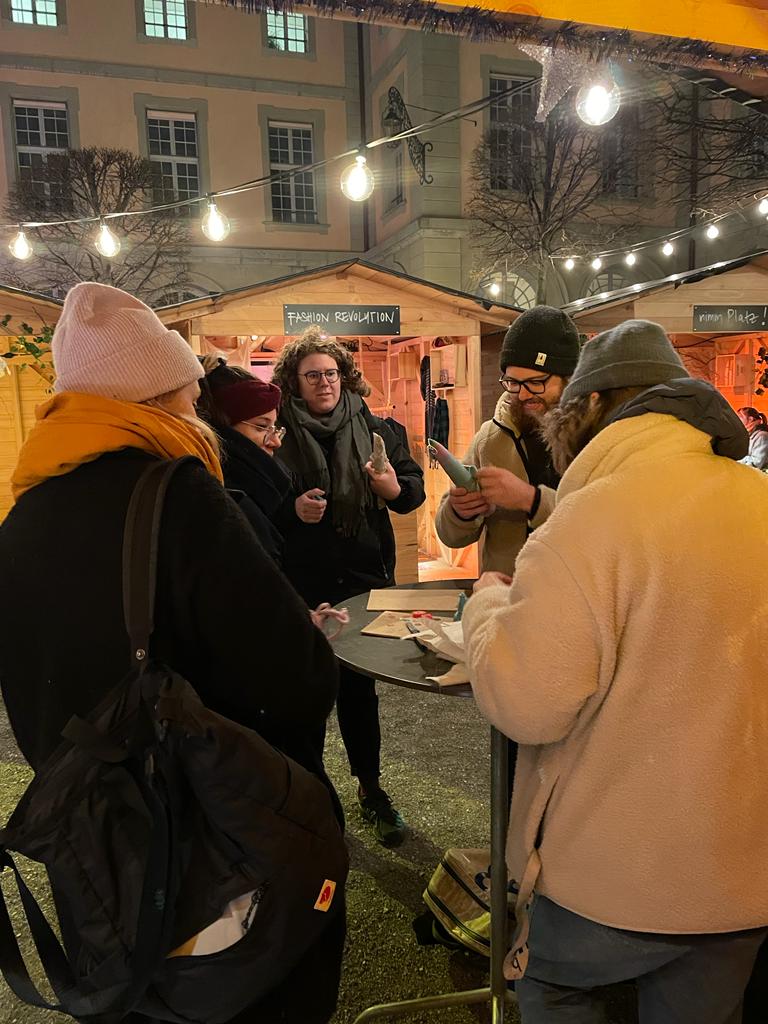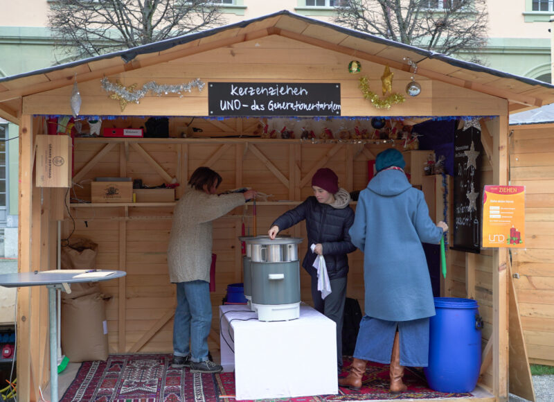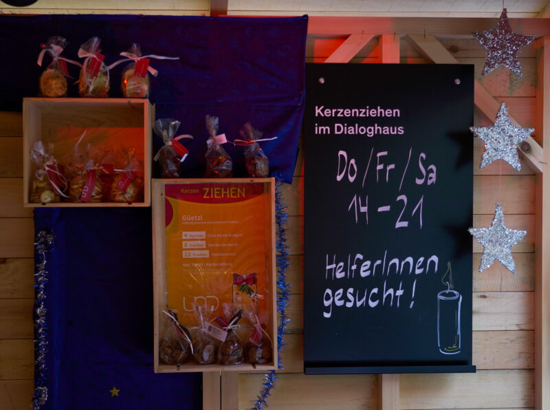 In der Schulküche gemeinsam während zweier Tage Güetzi ausstechen, backen und Gluschtiges in Säckli verpacken. Am Winterprogramm im Berner Generationenhaus das Kerzenzieh- und Dialoghäuschen aufbauen. In Thun gleich den gesamten Weihnachtsmarkt dekorieren. Schliesslich sowohl in Bern und Thun während der Adventszeit die Wachstöpfe fürs Kerzenziehen warmhalten; alle willkommen heissen, die gerne etwas Sinnvolles gestalten und es dann auch gleich nach Hause tragen möchten. Insgesamt packen circa 60 HelferInnen mit an und bringen Glanz, Licht und rundum Wärme in die Dezembertage.