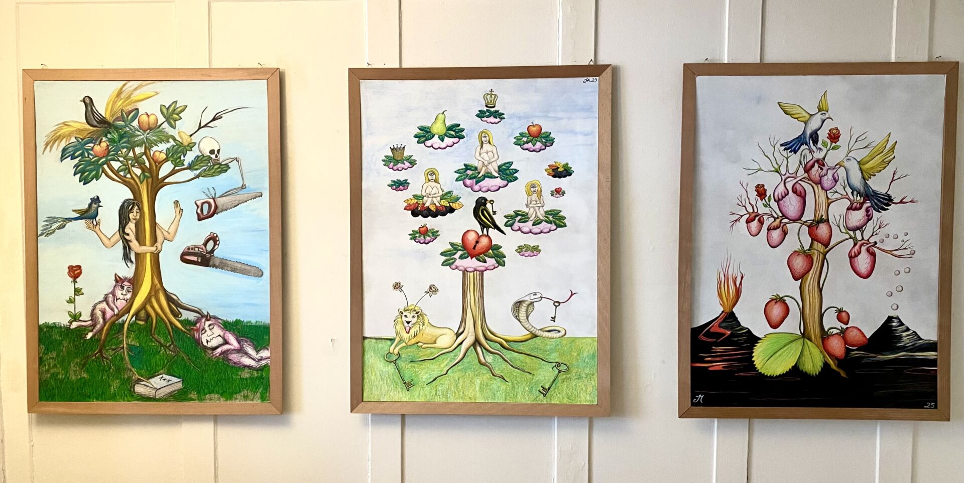 Drei blühende Lebensbäume voller Früchte und Figuren erzählen ebenfalls von Lichtgestalten und dunklen Mächten, wobei das Positive bei Weitem überwiegt. Die kleinen Monster sind eingeschlafen, der Löwe streckt keck die Zunge heraus, so dass man sich kaum vor ihm fürchtet und an der Zunge der Schlange, die an den biblischen Sündenfall erinnert, hängt einer der vier Schlüssel, die zum Herzen führen. Schwebende Frauenfiguren tragen auf der Stirn ein einziges inneres Auge voller Bewusstsein und Erleuchtung. Die märchenhaften Bilder strahlen eine Verspieltheit und Leichtigkeit aus, die auch Kinderherzen Zugang bieten.