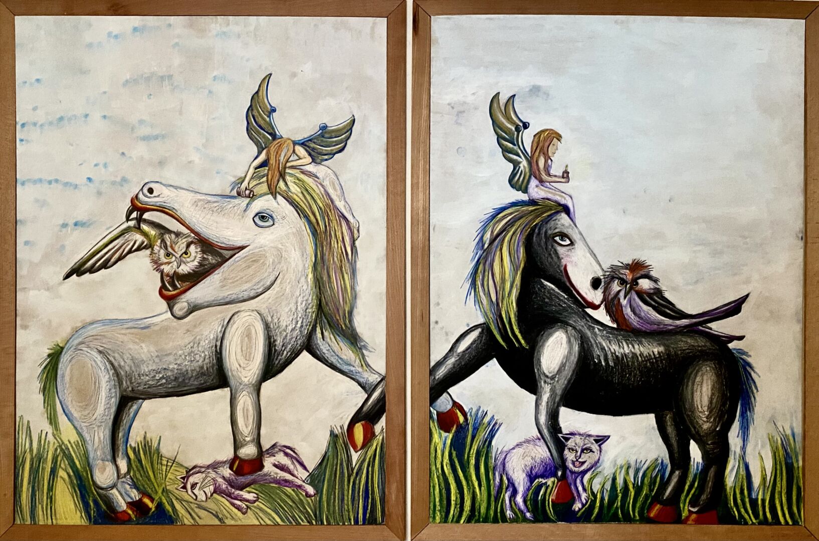 So luftig, leicht und farbenfroh die meisten der ausgestellten Bilder wirken, so tiefgründig und ambivalent imponieren die gemalten Sujets: Die Figuren, meist Mischwesen zwischen Mensch und Tier, mal freundlich lächelnd, dann wieder monsterhaft, stehen sich in ihrem Äussern, aber auch in ihrem Tun engelhaft und diabolisch gegenüber. Diese Dialektik erscheint bei vielen Werken als Leitmotiv. Es sind traumähnliche «Seelenbilder», die von Ambivalenz und der Kraft des Lebens berichten: Zwei Gegenwelten, häufig getrennt in beide Bildhälften, repräsentieren Gut und Böse, Freud und Leid, Leben und Tod. Doch ganz so einfach ist die Entscheidung nicht, die beiden Pole nicht immer sofort erkennbar: So ist beispielswese auf dem Doppelbild «schwarzes Pferd-weisses Pferd» das Schwarze, das meist mit Dunkelheit assoziiert wird, das Gute und das weisse Tier, dass an Licht denken lässt, das Zerstörerische.