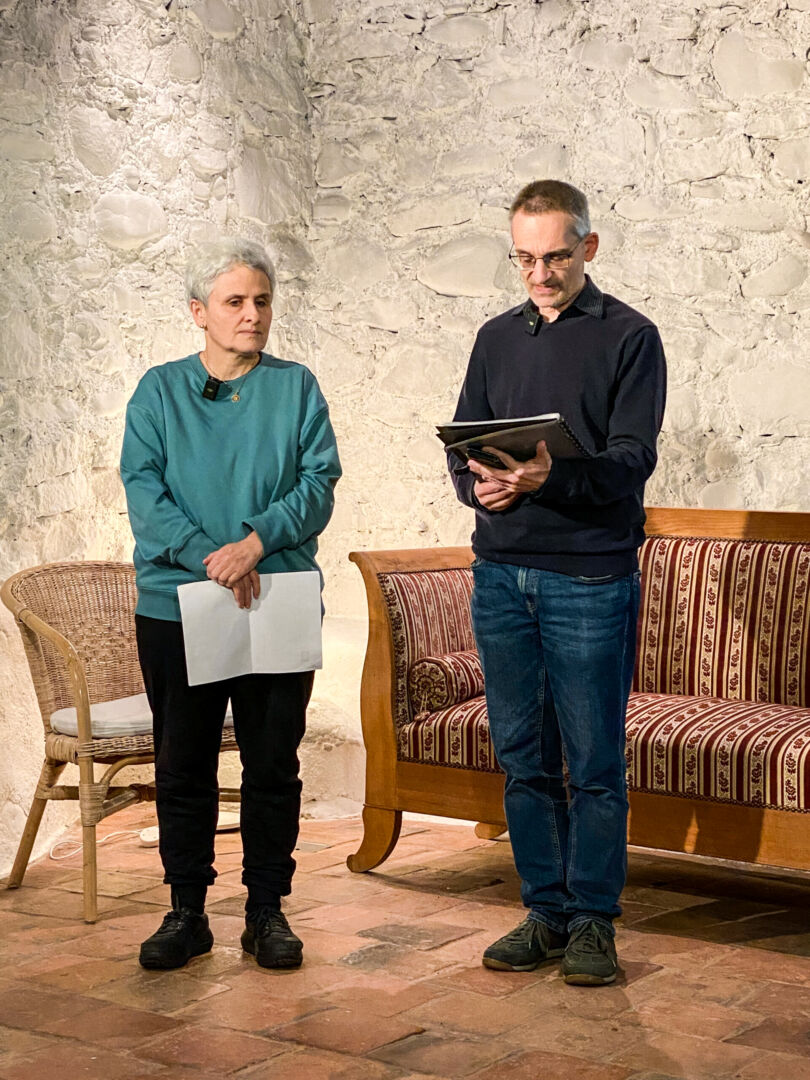 Im Gespräch: Eve Stockhammer und Michael Rom sprechen mit Rebekka Flotron im Saal des Offenen Höchhus über «Kaddisch zum Gedenken».