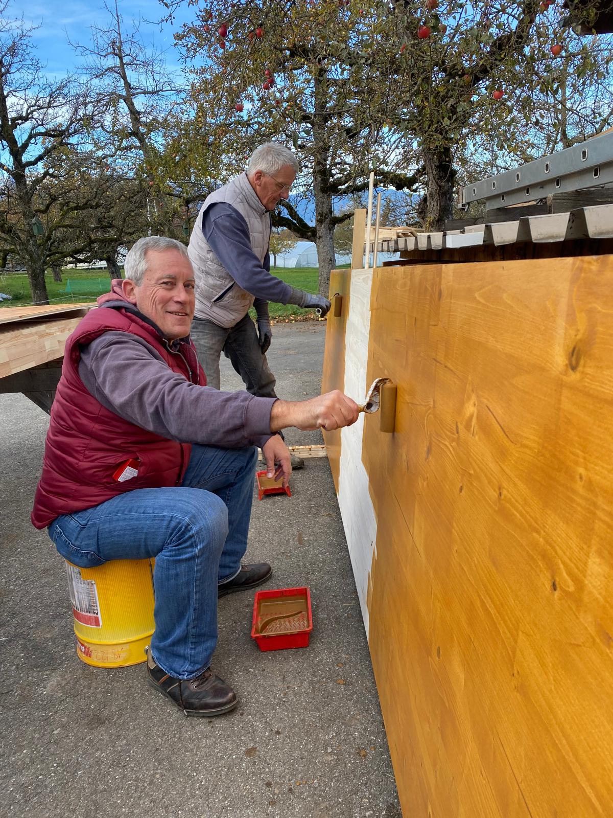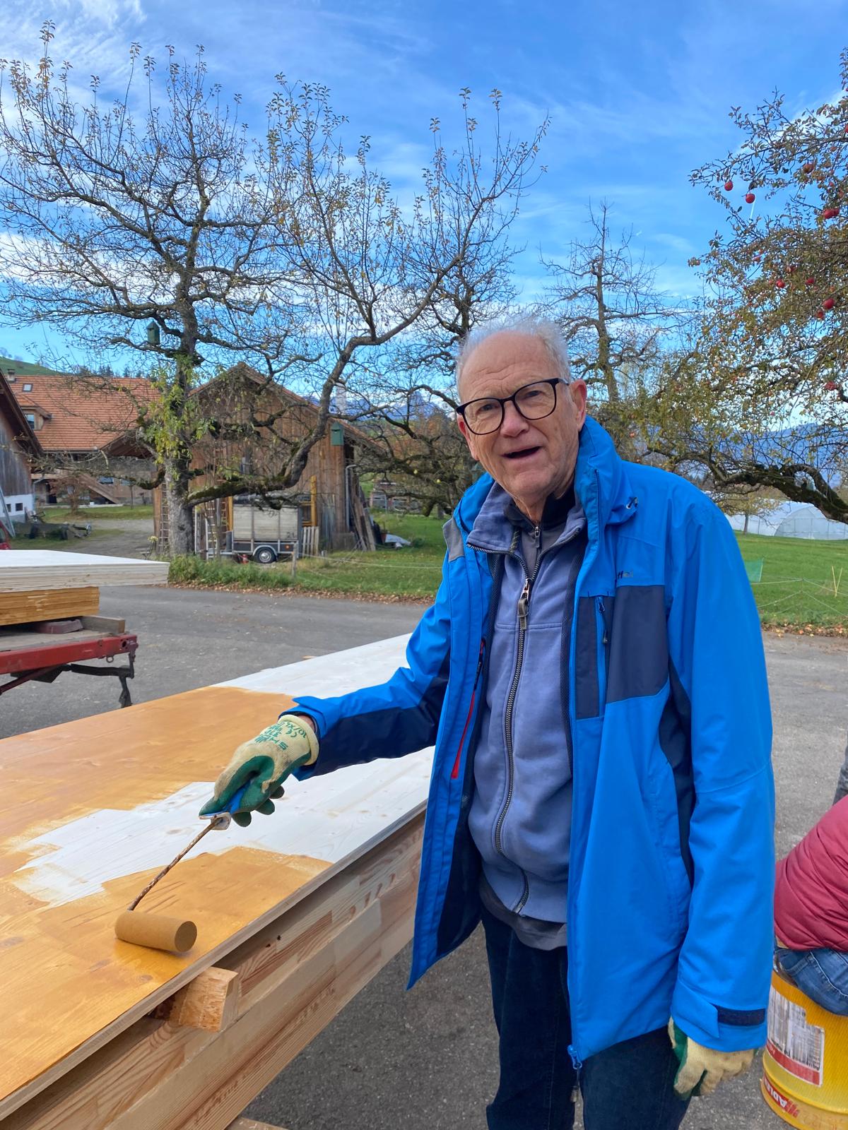 Wir sind in Zweierteams dabei, die verschieden langen und dicken Vierkanthölzer zu streichen. Wir tragen mit Rollen eine hellbraune Lasur auf das verleimte Fichtenholz auf. Auf die Frage, ob das Holz aus eigenem Wald stammt, sagt Ernst Schiffmann: «Nein, wir haben zu wenig Holz, und das wäre auch nicht geeignet dafür. Das Holz muss trocken sein. Unser Holz wird auch zum Heizen genutzt; wir haben eine Zentralheizung für Holz.»