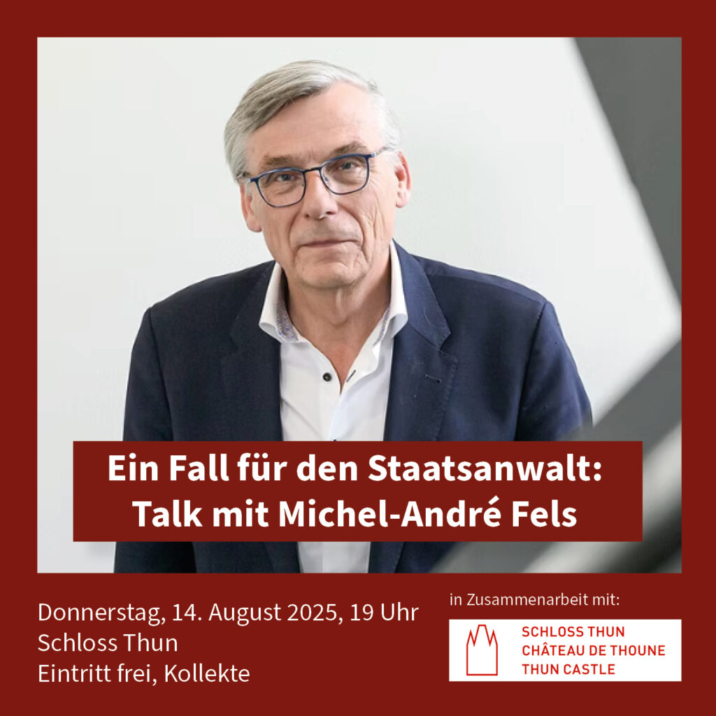 UND Generationentandem lädt in Zusammenarbeit mit dem Schloss Thun zum Talk mit Michel-André Fels. Von 2007 bis 2009 engagierte er sich in der Strafverfolgung des Bundes, von 2017 bis 2025 war er Generalstaatsanwalt des Kantons Bern. Er erlebte als Staatsanwalt diverse aufsehenerregende Verbrechen und tragische Unglücke, etwa das Canyoning-Unglück in der Saxetenbach-Schlucht (1999) oder der Callgirl-Moder in von Langenthal (2012).