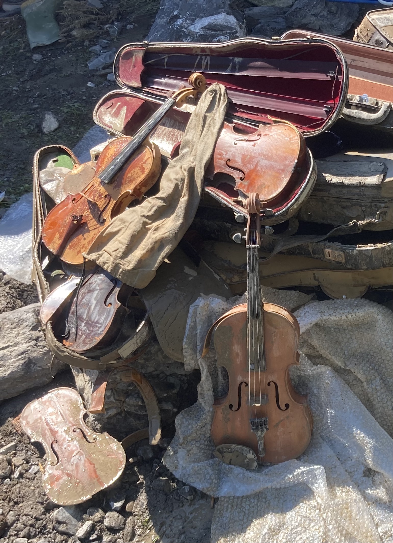 Die nahe gelegene Geigenbauschule wurde zum Glück verschont. Doch in Höslis Haus gab es etwa 40 Streichinstrumente sowie eine persönliche Bogen-Sammlung – für Hansruedi ein Teil der Altersvorsorge. In unterschiedlichem Zustand alles: einige Instrumente noch gut, andere liessen sich reparieren. Doch vieles war nicht zu retten. So eine Anzahl Schülerinstrumente, die für einen Transport nach Moldawien bereitlagen.