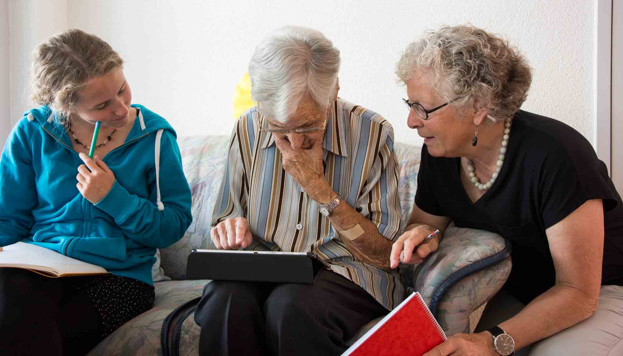 «Wie sieht Ihr Tagesablauf aus?» Manchmal stehe sie bereits um sechs Uhr auf, manchmal warte sie im Bett auf die Pflegerinnen. Um acht Uhr sei sie immer beim Frühstück anzutreffen. Mittags gebe es nicht immer ein Nickerchen. Am Nachmittag würden in den Räumlichkeiten des Pflegeheimes verschiedene Aktivitäten angeboten wie Stricken oder Basteln. Margrit Meyes findet das gut, sie nutze diese Angebote. Dann gebe es da noch die zwei Wellensittiche auf ihrer Etage, die sie täglich besuche. Ob für sie der Tag schnell vorbeigehe? Ja, sie könne sich gut «vertörlen», habe nie Langeweile. Natürlich gebe es Tage, an denen sie um halb vier auf die Uhr schaue und das Gefühl habe, es müsste eigentlich doch schon fünf sein. Doch dieses Phänomen sei für sie nicht Langeweile. Und abends – wieder huscht ein verschmitztes Lächeln über ihr Gesicht – da schnappe sie sich ihr Tablet.