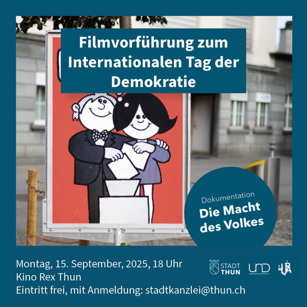 Die Stadt Thun lädt gemeinsam mit dem Jugendparlament Thun und UND Generationentandem am Montag, 15. September um 18.00 Uhr zu einem besonderen Filmabend ins Kino Rex ein. Gezeigt wird die SRF-Dokumentation «Die Macht des Volkes» – ein packender Film über die Herausforderungen der direkten Demokratie in der Schweiz.