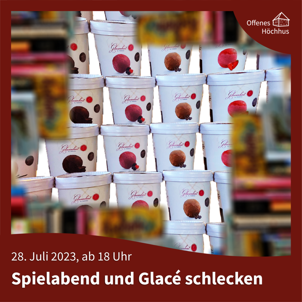 Hast du ein Lieblingsspiel, das zu anderen zeigen möchtest? Bring es vorbei! Lerne neue Menschen kennen, die gerne spielen und verbringt zusammen einen schönen Abend. Wir haben die Räumlichkeiten und die Glacé-Becher (Waldbeeren, Vanille, Schoggi, Stracciatella, Citron, Erdbeer), du das Spiel. Komm vorbei, probiere und mach mit!