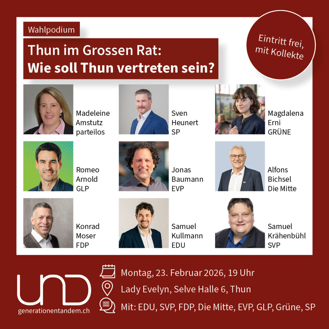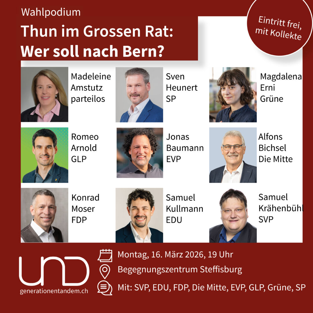 Wie soll sich der Wahlkreis Thun in den nächsten vier Jahren im Grossen Rat positionieren? Welche politischen Schwerpunkte braucht die Region? Diese Fragen stehen im Zentrum des Wahlpodiums von UND Generationentandem.