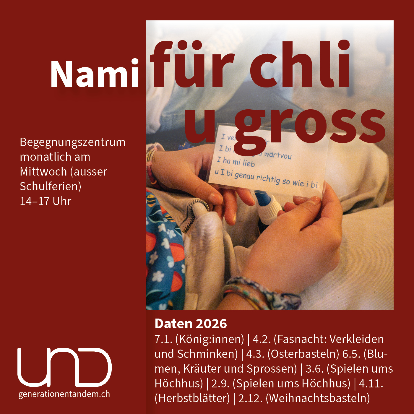 Ein spannender Nachmittag für Klein und Gross erwartet alle, die gemeinsam Zeit verbringen, kreativ werden und neue Begegnungen machen möchten. Wir basteln zusammen, hören Geschichten, entdecken Neues und Altes, setzen unsere Sinne ein und haben dabei jede Menge Spass. Das Programm richtet sich an Menschen jeden Alters, und alle sind herzlich eingeladen. Man kann den ganzen Nachmittag dabeisein oder nur einzelne Stationen besuchen – ganz nach Lust, Zeit und Interesse. Wer eigene Ideen einbringen und gemeinsam mit der Gruppe umsetzen möchte, ist ebenfalls willkommen.
