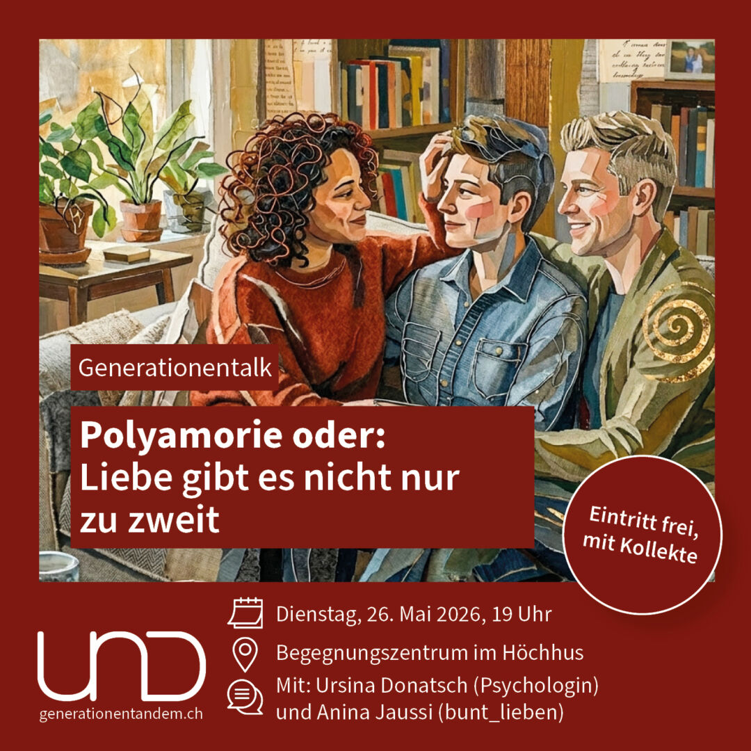 Zwei Generationen – ein Thema: Das ist der Generationentalk von UND Generationentandem. Jung und Alt diskutieren miteinander über brisante Themen aus Gesellschaft und Politik. Der Talk dauert zwischen 30 und 45 Minuten und wird von jungen Moderator:innen gestaltet. Danach hat das Publikum die Gelegenheit, sich an der Diskussion zu beteiligen.