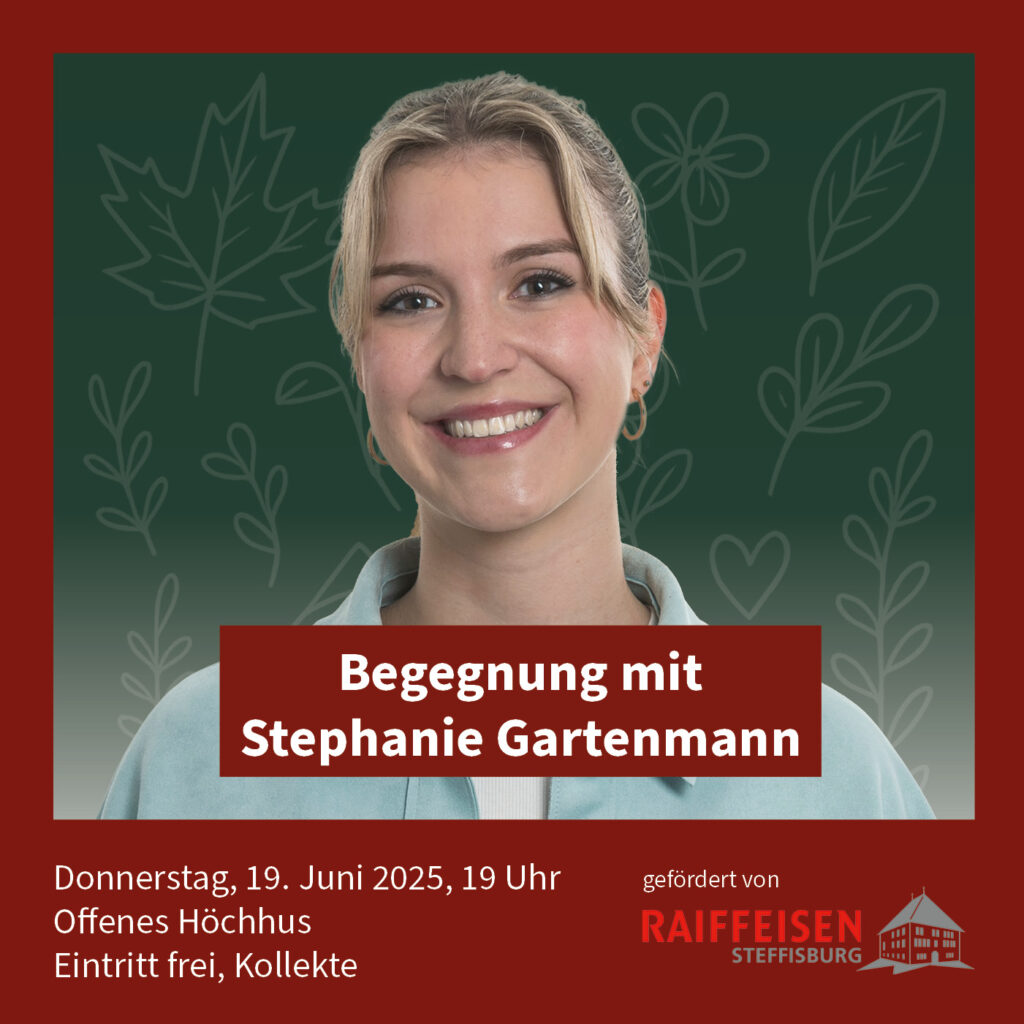 UND Generationentandem lädt ins Offene Höchhus zur Begegnung mit Stephanie Gartenmann (23). Die junge Berner Oberländerin ist unter anderem Generalsekretärin der Jungen SVP (JSVP), Podcasterin, Masterstudentin, Pferdenärrin und Eselsbotschafterin. Im Gespräch mit anschliessender Fragerunde und Apéro erklärt sie, wie sie alle ihre wichtigen Anliegen und Projekte unter einen Hut bringt.