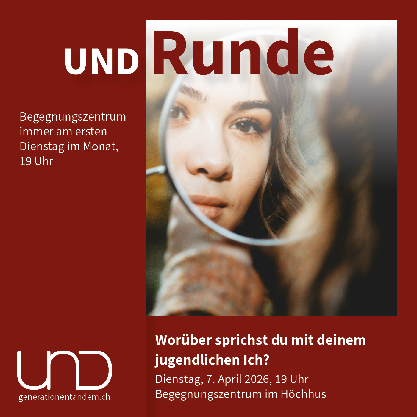 Die UND-Runde von UND Generationentandem im ist eine Art Stammtisch für den unverbindlichen Austausch. Ein Generationentandem lanciert zu Beginn das Gespräch mit eigenen Gedanken zu unterschiedlichen Themen von philosophisch bis politisch. Danach sind alle eingeladen, einen Antwortversuch zu wagen. Alle hören einander zu, alle können sich einbringen. Es ist ein ideales Gefäss, um neue Menschen kennenzulernen, unterschiedliche Meinungen zu hören und seinen eigenen Horizont zu erweitern.