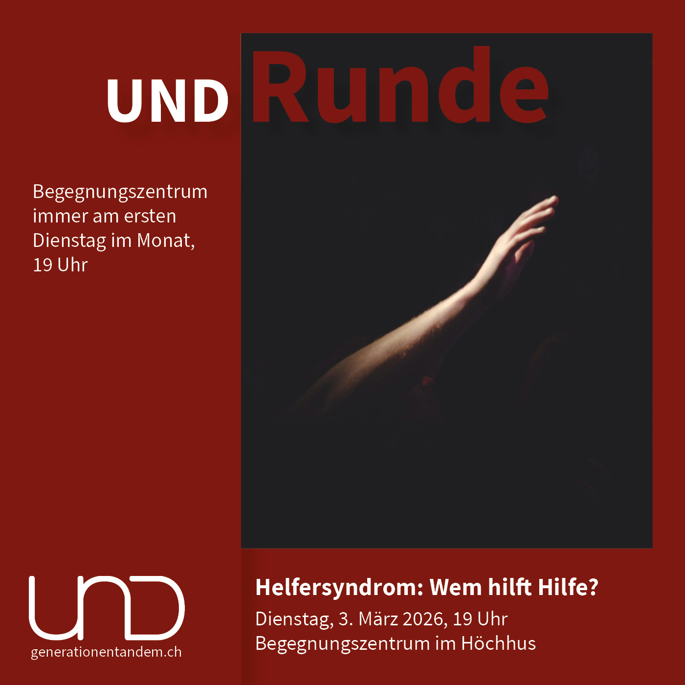Die UND-Runde von UND Generationentandem im ist eine Art Stammtisch für den unverbindlichen Austausch. Ein Generationentandem lanciert zu Beginn das Gespräch mit eigenen Gedanken zu unterschiedlichen Themen von philosophisch bis politisch. Danach sind alle eingeladen, einen Antwortversuch zu wagen. Alle hören einander zu, alle können sich einbringen. Es ist ein ideales Gefäss, um neue Menschen kennenzulernen, unterschiedliche Meinungen zu hören und seinen eigenen Horizont zu erweitern.
