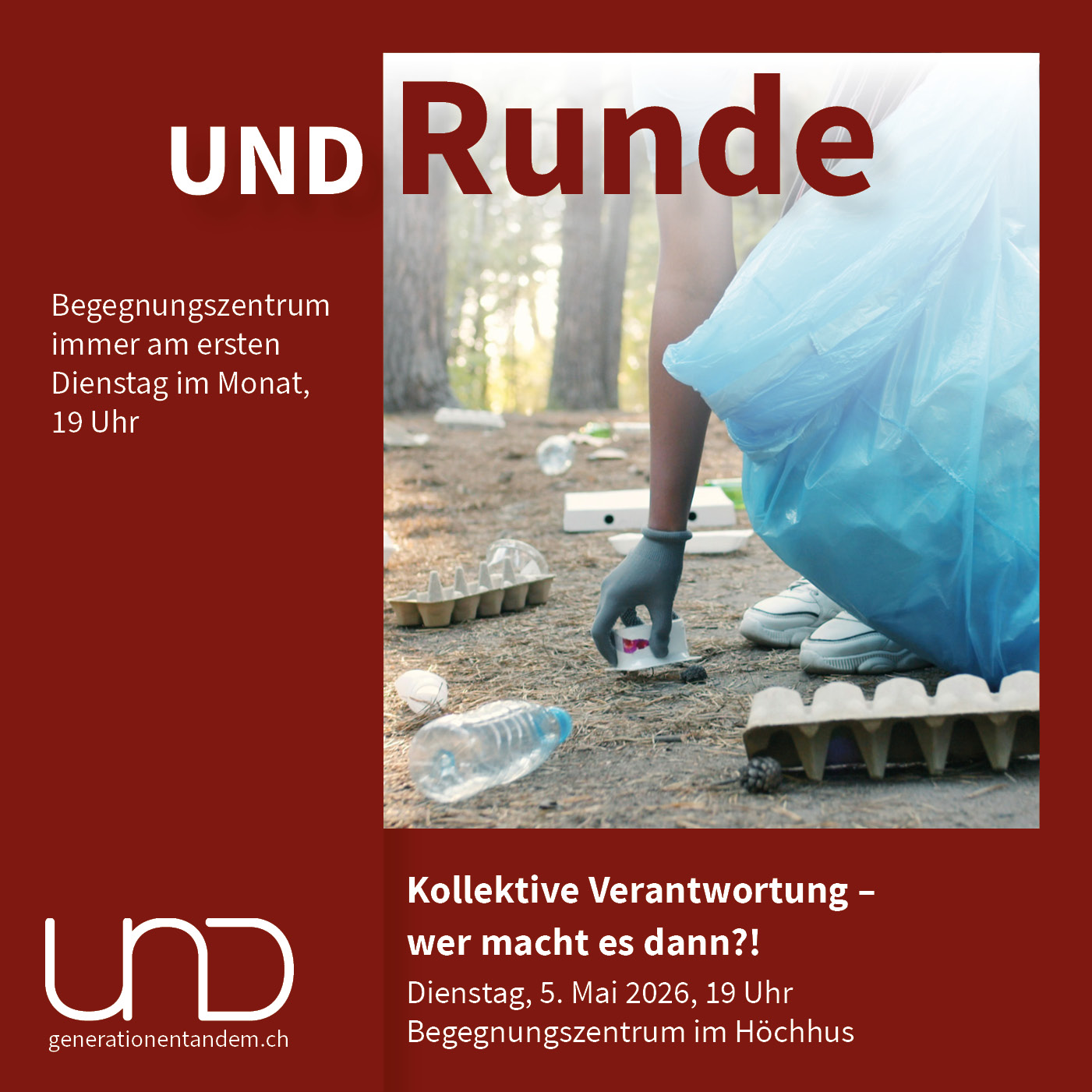 Die UND-Runde von UND Generationentandem im ist eine Art Stammtisch für den unverbindlichen Austausch. Ein Generationentandem lanciert zu Beginn das Gespräch mit eigenen Gedanken zu unterschiedlichen Themen von philosophisch bis politisch. Danach sind alle eingeladen, einen Antwortversuch zu wagen. Alle hören einander zu, alle können sich einbringen. Es ist ein ideales Gefäss, um neue Menschen kennenzulernen, unterschiedliche Meinungen zu hören und seinen eigenen Horizont zu erweitern.