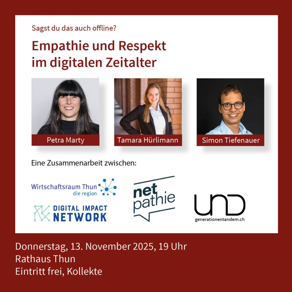 Dieses Jahr laden der Wirtschaftsraum Thun, das DIN Chapter Thun, Netpathie Schweiz und UND Generationentandem die Bevölkerung gemeinsam zu einem digitalen Podium im Rathaus ein.