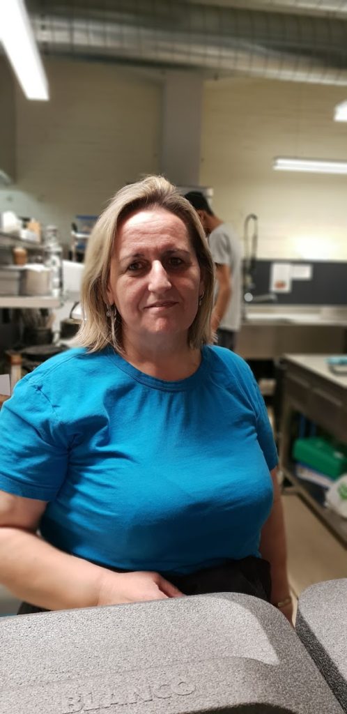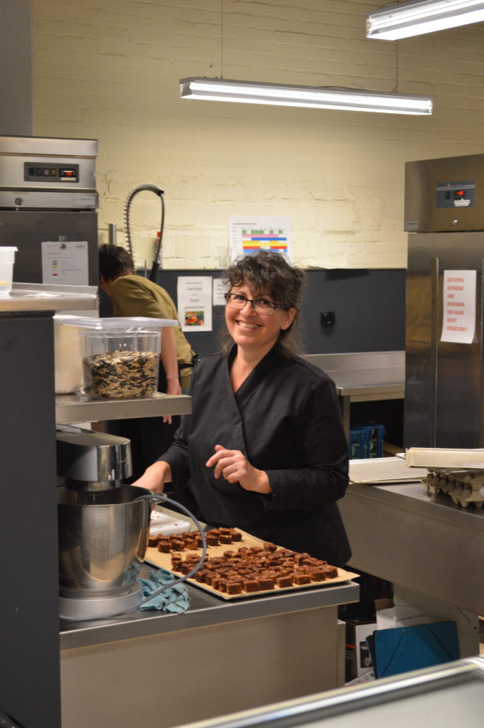 Im Angebot des «Dreigängers» stehen je ein Fleisch- und ein Vegimenü, Salat und Suppe. Susanne Wagner (53) schneidet einen Kuchen in Stücke. Sie ist eine von drei Frauen, die als Köchinnen und Arbeitsagoginnen die Küche abwechselnd leiten. Sie macht das ganz unauffällig.