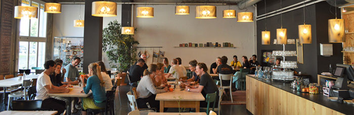Kurz vor 12 Uhr kommen die ersten Gäste und bald füllt sich das Lokal. Konsequent regionales, saisonales Essen mit Gemüse und Fleisch in Bioqualität zu einem fairen Preis scheint sehr beliebt zu sein. Es schmeckt auch. Zu uns hat sich jetzt Sabine Zaugg (46) gesellt, die Verantwortliche für Kommunikation und Fundraising. Sie erklärt, dass immer mittwochs und freitags ein Surprise-Menu gegen Foodwaste angeboten wird, bestehend aus den Resten der Vortage.