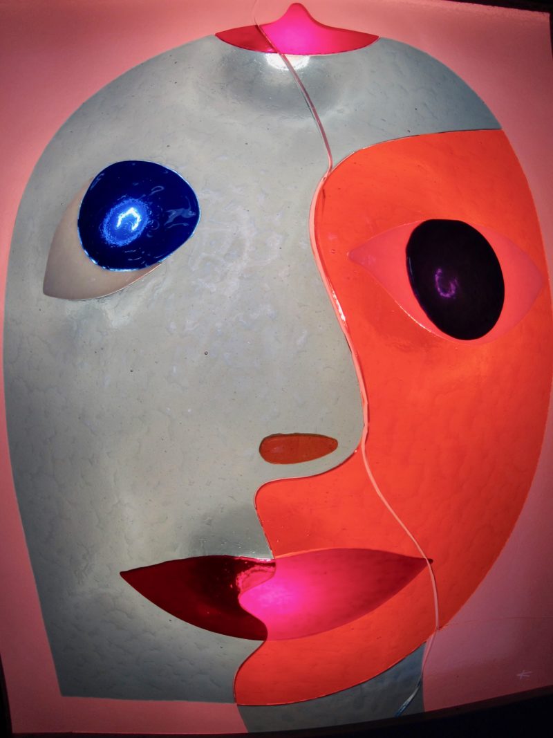 Ausdruck und Farbe sind auf der linken Gesichtshälfte anders als rechts. In der Mitte finden sie aber zusammen. Je nach Blickwinkel kann die Betrachterin, der Betrachter  verschiedene Seelenzustände wahrnehmen oder auch eigene Gefühle hineinprojizieren. Materie, Seele und Kommunikation kann ich so vereint darstellen.