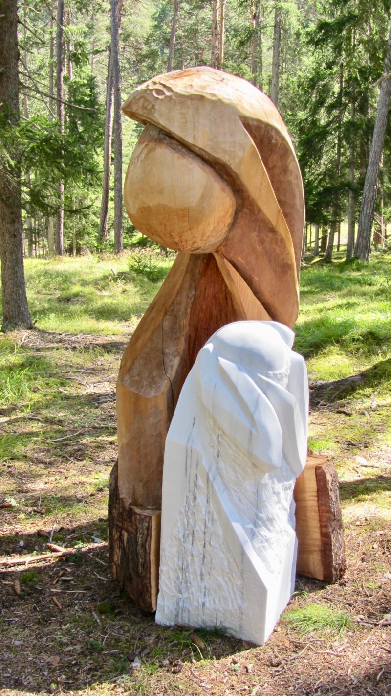 Geborgenheit, Doppelfigur aus Holz und Marmor. – Bild: Jürg Krebs