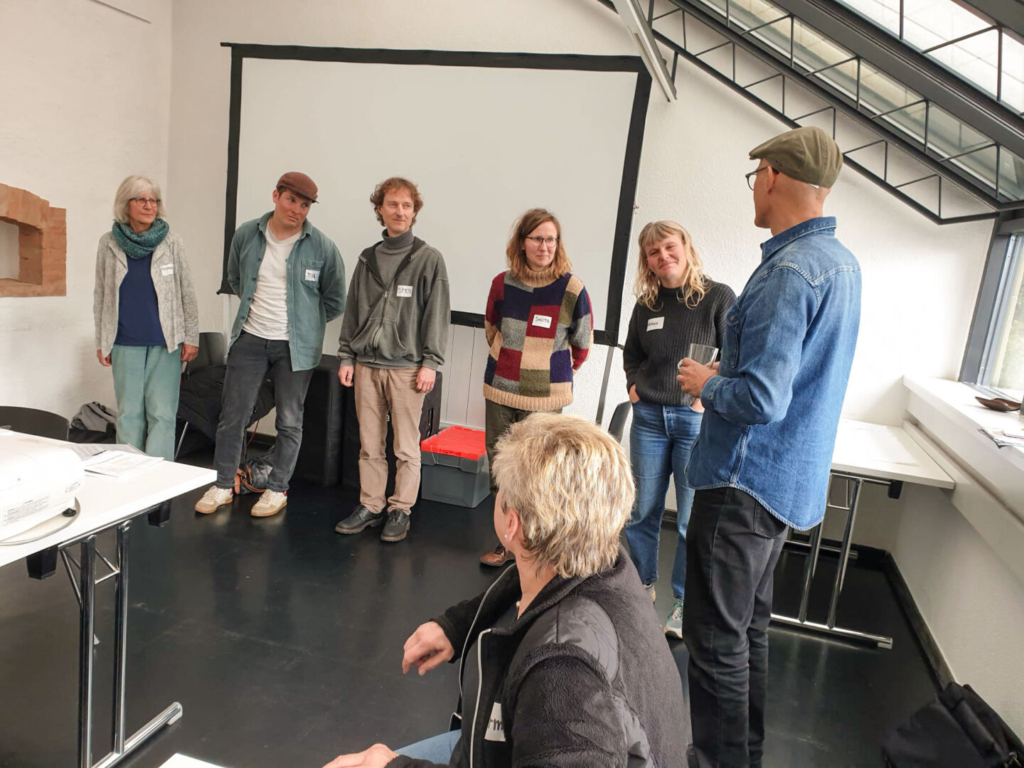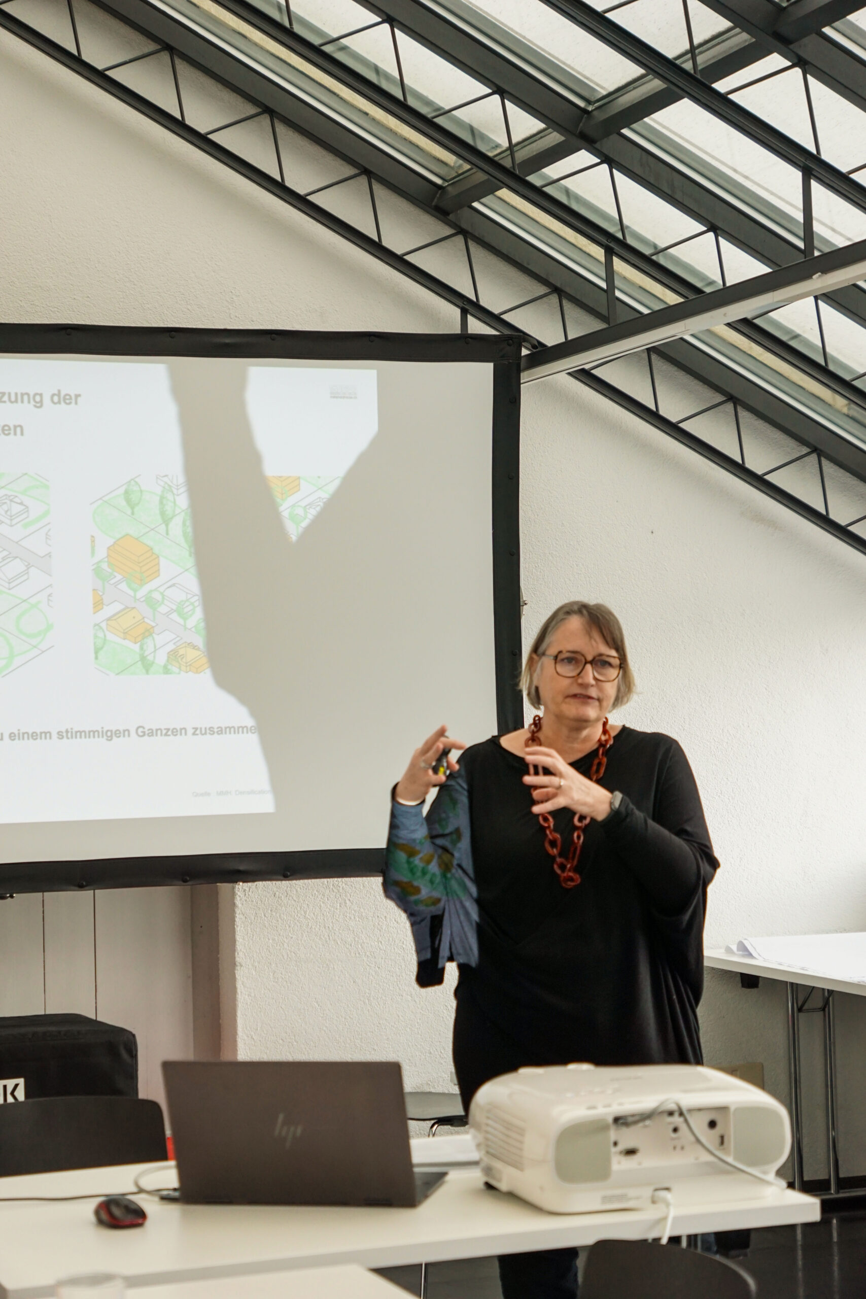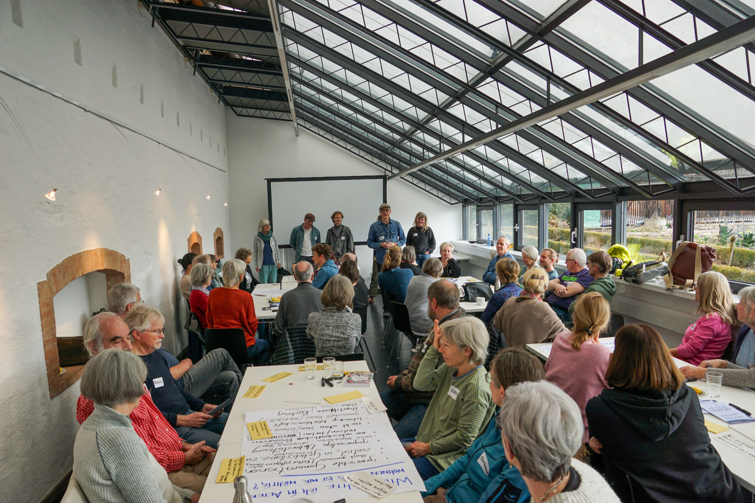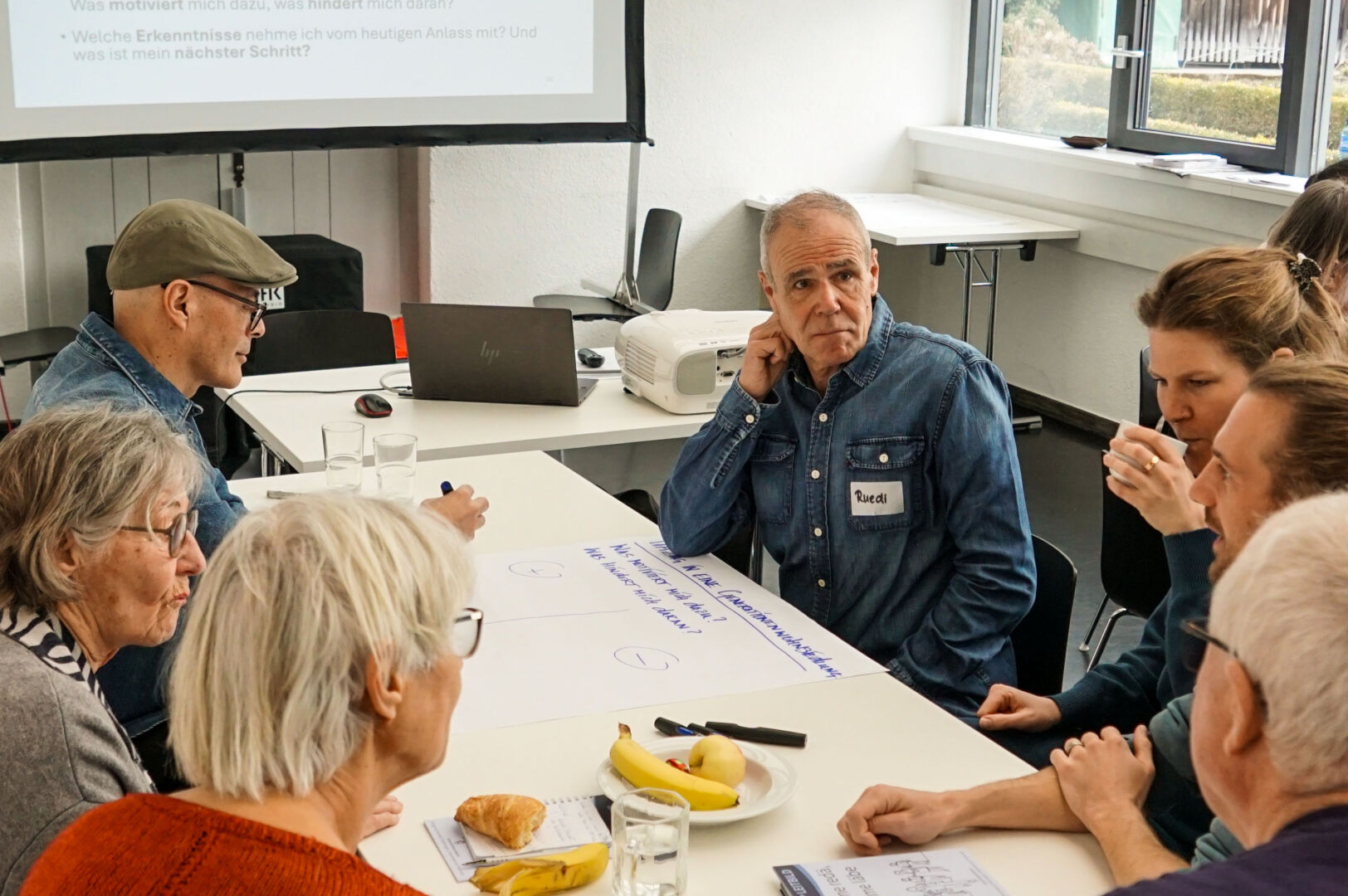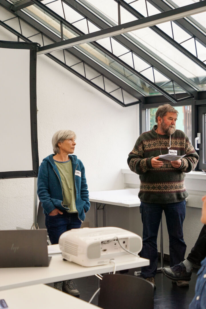 Elsbeth Waldburger und Jeanpierre Stucki bewohnen das Mehrgenerationenhaus wohnenplus in Steffisburg und können darum aus erster Hand davon berichten. Das Haus habe den Ruf, ein Luxusprojekt zu sein, erklärt Elsbeth. Das liege wohl an der Grösse der Wohnräume, die tatsächlich grosszügig bemessen sind. Der energieeffiziente Holzbau ist begrünt mit Kiwi, Glyzinien und Klematis. In den Wohnungen verschiedener Grössen und den zwei «Clusterwohnungen» leben im Moment 30 Erwachsene und 13 Kinder.Im obersten Geschoss befinden sich ein kleiner Gemeinschaftsraum, eine Sauna mit Whirlpool und eine grosse Terrasse mit wunderbarer Aussicht, im EG ein Gemeinschaftsraum und eine inklusive Kita. Das Haus ist umgeben von einem grossen Gemeinschaftsgarten. Laut Vorschriften darf ein Parkplatz nicht fehlen, obwohl fast alle mit Fahrrädern unterwegs sind. Viele lachen, als Elsbeth erklärt, die Struktur des Hausvereins sei einfach, denn was auf der Leinwand erscheint, sieht überaus kompliziert aus. Alle Bewohner:innen ab 14 Jahren engagieren sich in einer der Betriebsgruppen.